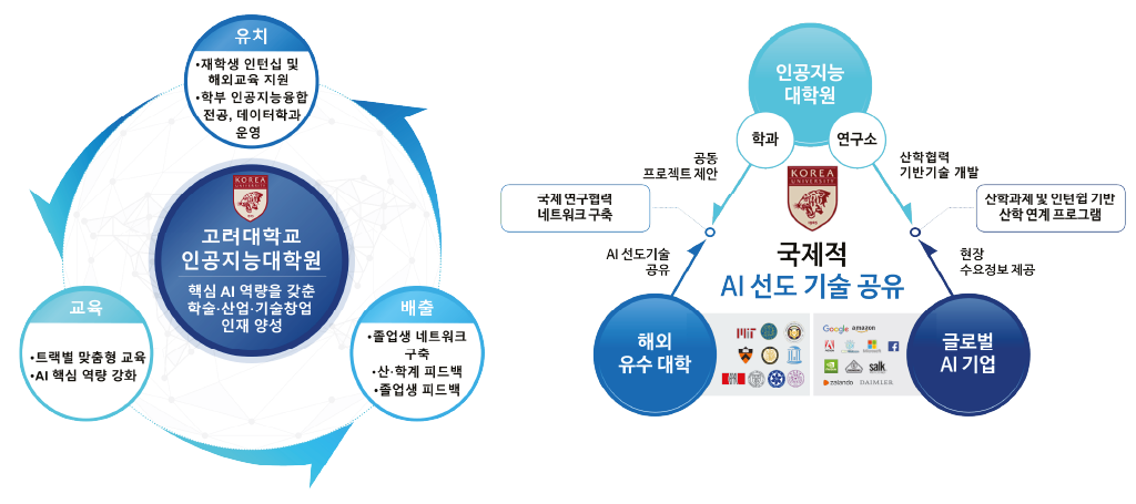 1) 개요 - 글로벌 경쟁력을 갖춘 석·박사급 AI 핵심 인재 양성을 통한 세계적 수준의 인공지능대학원 도약 - AI 학술 인재, AI 산업 인재, AI 기술창업 인재 양성 2) 전공명 - 인공지능 3) 주요 내용 - 혁신적인 AI 기술 개발을 선도하는 AI 학술 인재양성을 위한 세계 유수 대학/연구소와의 국제 공동연구 네트워크 강화 - 기업 수요 기반의 문제 해결 능력을 갖춘 AI 산업 인재양성을 위한 국내외 AI 선도 기업과 산학협력 체계 강화 - 새로운 가치를 창조하는 AI 기술창업 인재양성을 위한 고려대학교와 안암-홍릉 밸리의 창업 인프라 활용 - (AI+X 특화 분야) 헬스케어, 금융, 에이전트, 게임, 자율주행, 국방, 지능로봇 - (핵심 연구 분야) 딥러닝, 컴퓨터비전, 자연어처리, 음성인식, 빅데이터, 신경망, LLM ![]() |