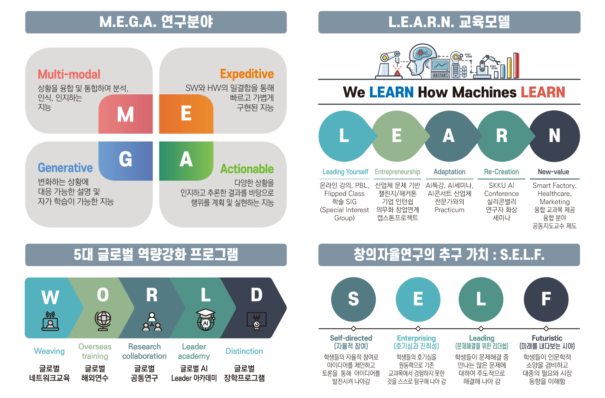 - 글로벌 역량 강화를 위한 5대 프로그램 W.O.R.L.D.과 창의자율 S.E.L.F.연구를 통한 AI글로벌 선도인재 양성